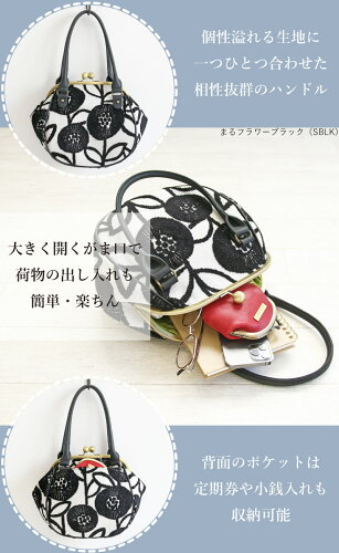 ソアソウル ジャカード 丸花柄 口金 ガマ口 バッグ 86229081日本製 インポートゴブラン クロ/白 革付属 可愛い お出かけ とても軽い ポップアート花 大ヒット中