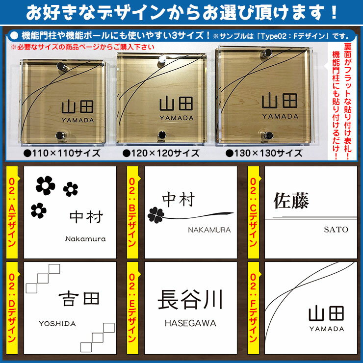 アクリル表札 ネームプレート 二層板表札 クリスタル Type02:2点ビス仕様【130×130mm】 機能ポールや平らな面に貼るだけで使える便利な表札! 販売条件 ◆詳しくはこちらをご確認ください サイズ W130×H130×T26mm 約250g カラー カラーサンプルをご確認ください 仕様 表札(取付可能場所:郵便ポスト・機能門柱・機能ポール・門扉・ガラス・扉・その他凹凸の無い場所) デザイン:6種(文字数やデザインにより文字位置や文字サイズが多少異なります。