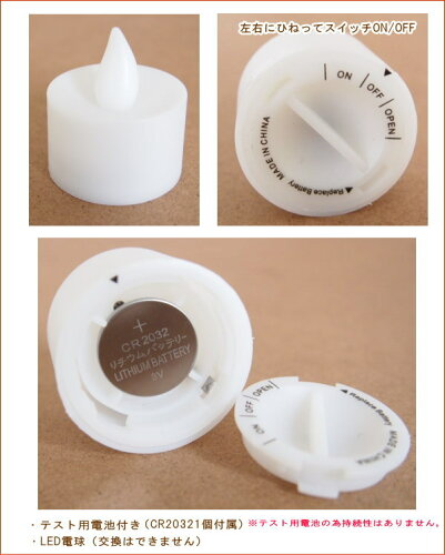 本物のキャンドルのように優しくあたたかい明かりが灯るLEDライト クリスマスハウスは こちら ・Spec 商品名 ティーライトキャンドルLEDライト サイズ Φ約4.0cm×H約4.5cm 備考 ボタン電池(CR2032)1個使用 ※テスト用電池が付いていますが持続性がありません。